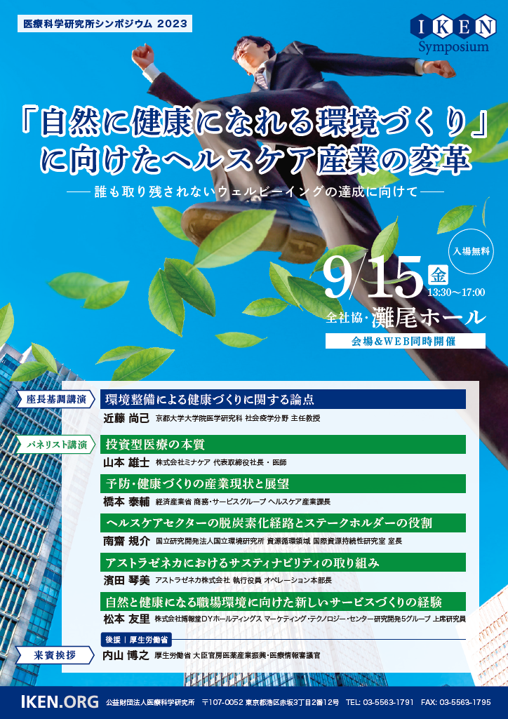 2024年度から始まる「健康日本21(第三次)」の基本的な方向でも、「自然に健康になれる環境づくり」を目指すことがうたわれています。健康経営の取り組みなど社会環境の改善によって健康格差を是正するだけでなく、カーボンフットプリントなど地球環境の保全により将来世代をも守り抜くため、ヘルスケア産業を含めた多様なプレイヤーたちが何をどう取り組んでいくべきなのか──本シンポジウムでは、そのような観点から、具体的な実践事例を踏まえた発表がなされました。座席数を減らしての会場には約40名、オンラインには約160名の皆様にご参加いただきました。