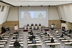 今回の産官学シンポジウムは、新型コロナウイルス感染症の影響により、会場とオンラインシステムを使用したZoomウェビナーでの同時開催といたしました。会場の灘尾ホールには距離をとりながら約30名、ウェビナーには約120名の方にご参加いただきました。
